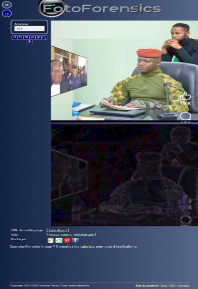 Une analyse Error Level Analysis (ELA) effectuée via l’outil de détection FotoForensics sur la capture montre des différences de compression autour de certains éléments, comme l’écran placé sur la gauche et le personnage ajouté en arrière-plan. Ces anomalies sont compatibles avec un photomontage numérique.