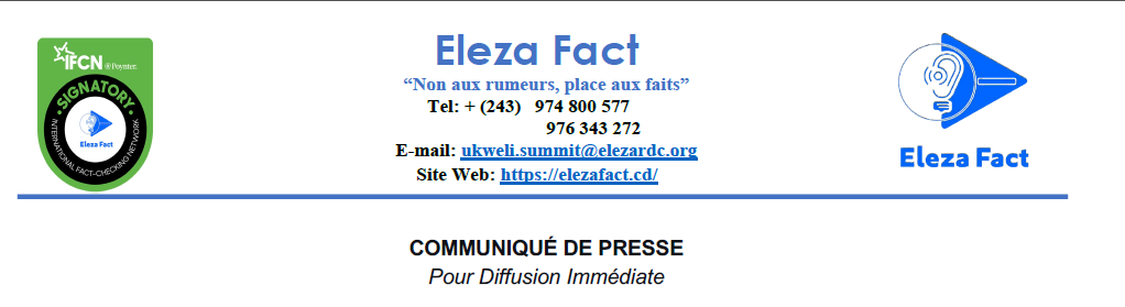 KINSHASA, 10 novembre 2025 – L'organisation indépendante de vérification des faits, Eleza Fact, annonce la tenue du premier Sommet sur la lutte contre la désinformation en République démocratique du Congo. Cet événement fondateur, placé sous le thème « Face aux crises, la vérité factuelle pour défendre », se tiendra à Kinshasa les 6 et 7 avril 2026.