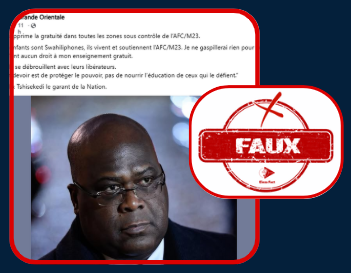 La page Facebook Grande orientale a publié, le jeudi 4 septembre dernier, une publication alléguant que le président de la République a supprimé la gratuité de l’enseignement dans les zones occupées par l’AFC/M23. Elle affirme : « Je supprime la gratuité dans toutes les zones sous contrôle de l’AFC/M23. Ces enfants sont Swahiliphones, ils vivent et soutiennent l’AFC/M23. Je ne gaspillerai rien pour eux. Ils n’ont aucun droit à mon enseignement gratuit. Qu’ils se débrouillent avec leurs libérateurs. Mon devoir est de protéger le pouvoir, pas de nourrir l’éducation de ceux qui le défient. »