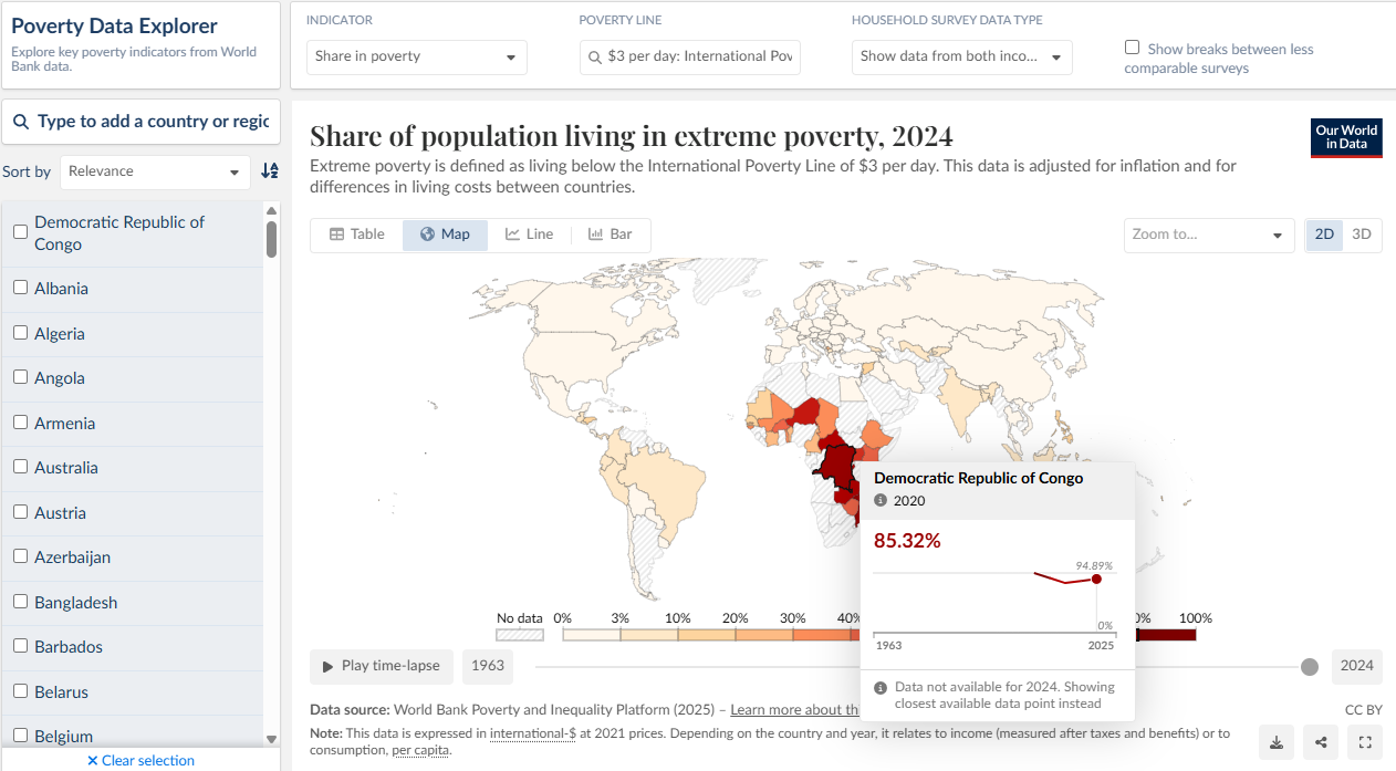 Les données (archivées ici) disponibles sur la pauvreté mondiale, notamment sur la plateforme Our World in Data, s’appuient sur la base « Poverty and Inequality Platform » de la Banque mondiale et ne classent pas les pays selon un ordre de pauvreté. Ces données visent à mesurer la proportion de population vivant sous des seuils de pauvreté définis (par exemple 2,15 $ ou 3,65 $ par jour, en parité de pouvoir d’achat), sans établir de palmarès. La RDC y figure avec des estimations actualisées issues de 2020, mais aucun indicateur récent ne confirme qu’elle serait « la plus pauvre du monde ». Le site ne présente aucun classement crédible plaçant la RDC comme première au monde dans cette catégorie, mais les chiffres présentés sur la RDC sont issus de données recueillies en 2020 et non en 2025. L’article de Visual Capitalist repose sur une interprétation erronée de données anciennes et ne correspond à aucune publication officielle récente.