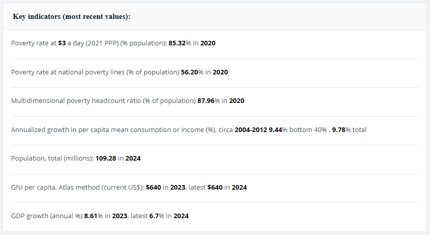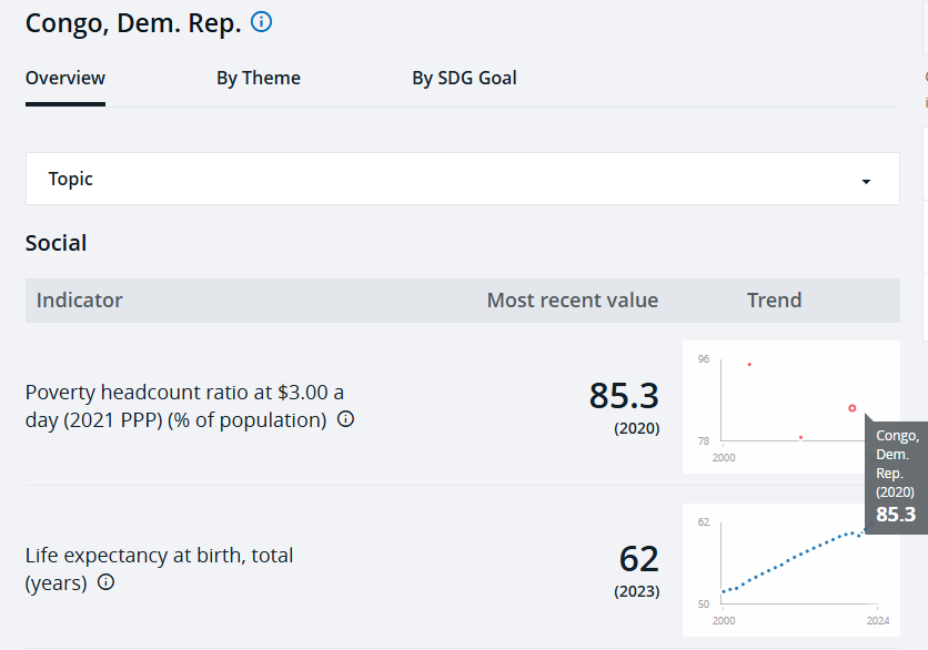 De même manière, le profil de la RDC présent sur le site officiel de la Banque mondiale (archivé ici) indique que plus de 85 % de la population vit avec moins de 3 dollars par jour, selon les dernières données disponibles, datant de 2020, qui n’ont rien à voir avec les données actuelles. Le pays affiche également une espérance de vie moyenne d’environ 62 ans et une population dépassant les 109 millions d’habitants, ce qui illustre la pression croissante sur les infrastructures sociales et les services publics. Toutefois, la Banque mondiale ne présente aucun classement mondial des pays les plus pauvres : elle publie des profils économiques et sociaux nationaux à titre d’information statistique. Ainsi, les données officielles confirment une situation socio-économique préoccupante, mais elles ne corroborent pas les rumeurs affirmant que la RDC occuperait la première place mondiale parmi les pays dits « extrêmement pauvres », d’autant plus que les données sont anciennes de plus de cinq ans.
