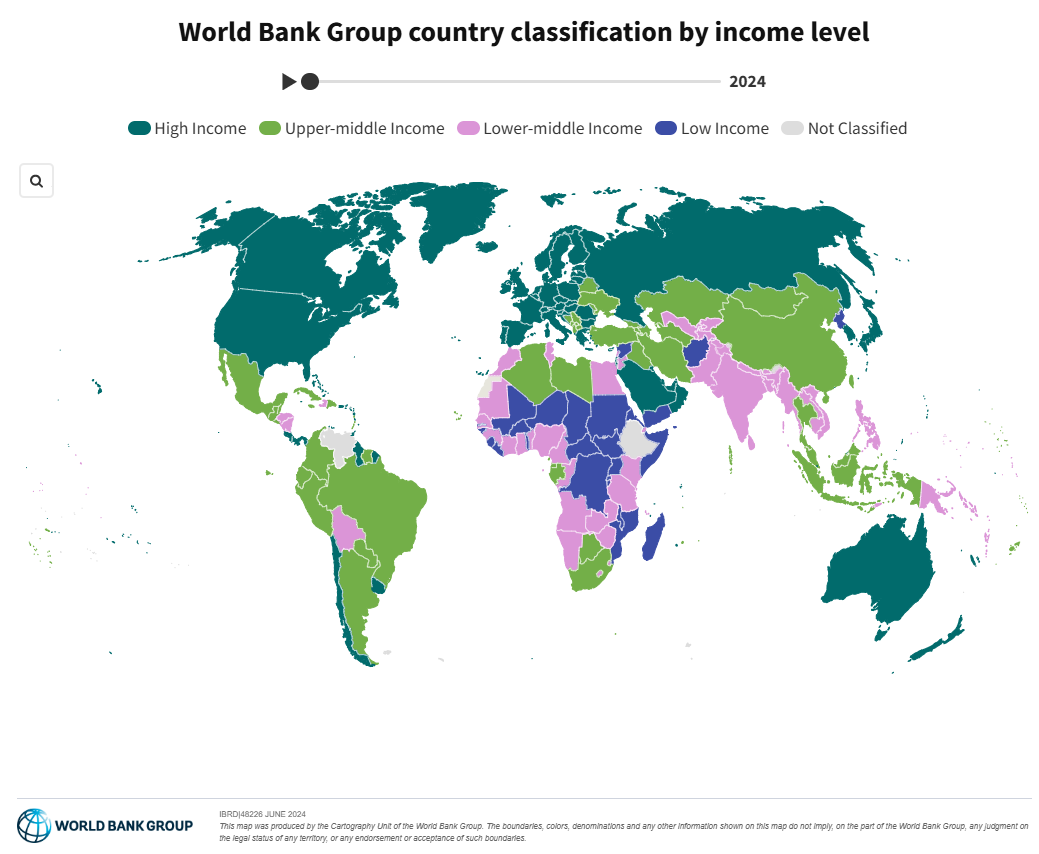 Cartographie catégorisant les pays du monde selon les 4 groupes de niveau de revenu, capturée par Eleza Fact