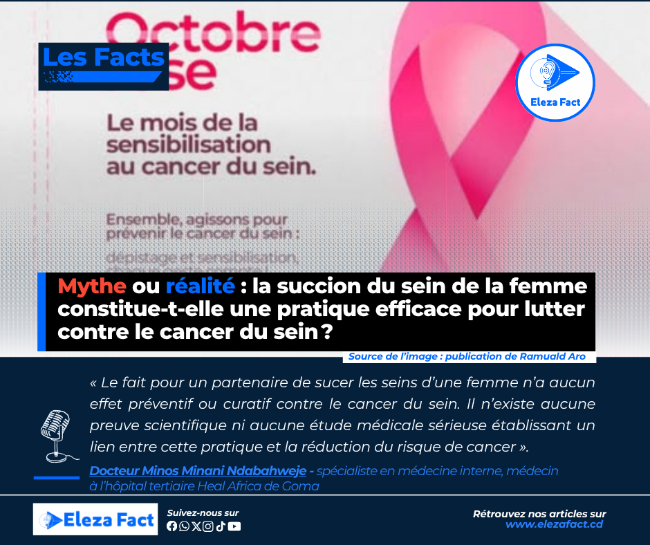 Pour commencer, Eleza Fact est entré en contact avec le Docteur Minos Minani Ndabahweje, spécialiste en médecine interne, médecin à l’hôpital tertiaire Heal Africa de Goma, ainsi qu’enseignant et chercheur à la faculté de médecine de l’Université de Goma. Celui-ci a répondu en ces termes : “Le fait pour un partenaire de sucer les seins d’une femme n’a aucun effet préventif ou curatif contre le cancer du sein. Il n’existe aucune preuve scientifique ni aucune étude médicale sérieuse établissant un lien entre cette pratique et la réduction du risque de cancer. Le cancer du sein est une maladie complexe, influencée par plusieurs facteurs tels que : les antécédents familiaux et génétiques (mutations BRCA1 et BRCA2, par exemple) ; les variations hormonales ; l’âge ; le mode de vie (alimentation, consommation d’alcool, tabac, activité physique, etc.).”