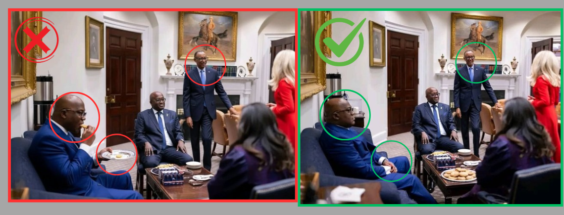 En comparant les deux images, on remarque clairement que celle montrant le président congolais tenant une assiette en main et en train de manger à bel et bien été altérée. Tout d'abord, le visage de Paul Kagame change de manière anormale et ne lui ressemble pas exactement, bien qu'il conserve la même position que sur l'image originale. Le visage de Félix Tshisekedi présente également des différences notables, avec des anomalies visibles au niveau de la bouche, de la joue droite et du cookie porté à la bouche. De plus, plusieurs incohérences apparaissent au niveau de la principale locataire de l'assiette et sur l'assiette elle-même. L’ensemble de ces éléments suggère une modification par intelligence artificielle.