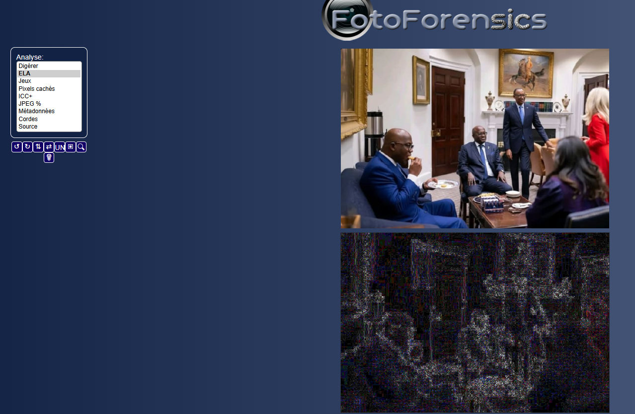 Par ailleurs, l'utilisation de Fotoforensic a permis de remédier aux anomalies flagrantes de compression. Sur l'image où le président congolais est présenté en train de manger, on observe des niveaux de blanc très localisés sur sa main droite, le biscuit et autour de sa bouche. Cette luminosité excessive indique que ces éléments ont été insérés ou modifiés avec un taux de compression différent du reste de l'image. De plus, la zone où se trouve l'assiette sur la table présente un « bruit plat », caractéristique de l'utilisation d'un outil de tampon ou de remplissage destiné à masquer l'objet original. Ces disparités techniques démontrent que l'image a été falsifiée.