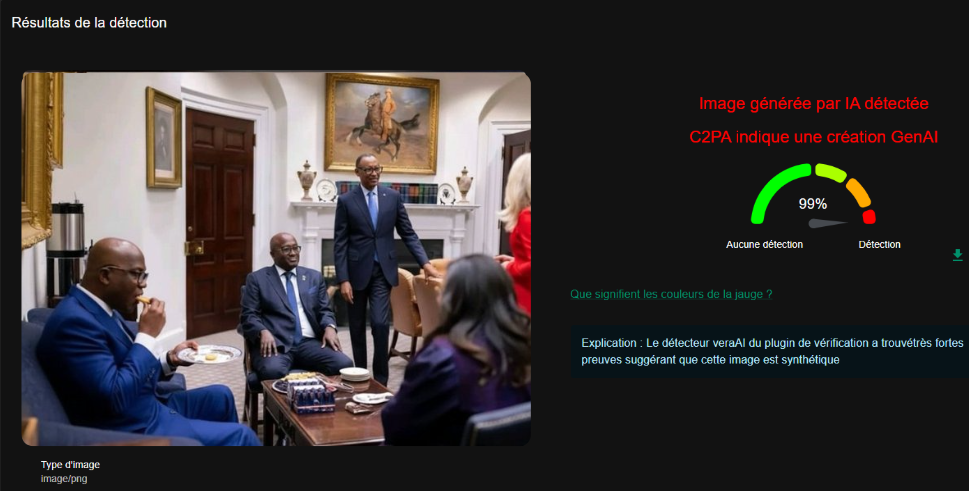 L'image montrant Félix Tshisekedi présentée en train de manger des biscuits en présence de Paul Kagame et d'autres responsables politiques est trompeuse. Les vérifications démontrent que la photo diffusée sur les réseaux sociaux a été altérée par rapport à la version originale authentique. Les analyses techniques révèlent des anomalies visuelles et numériques claires, confirmées par plusieurs outils de détection, indiquant l'intervention d'une intelligence artificielle. Par conséquent, cette image relève d'une manipulation destinée à induire le public en erreur et à susciter des réactions moqueuses à l'égard du président de la République démocratique du Congo.