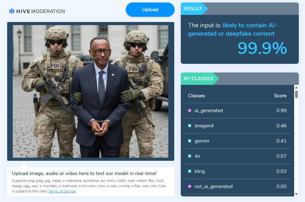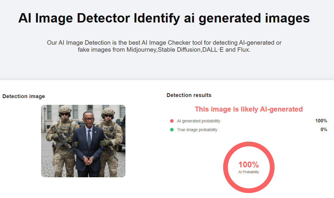 L’image prétendant montrer l’arrestation de Paul Kagame par le FBI est entièrement fausse et générée par l’intelligence artificielle. Les analyses techniques confirment sa nature artificielle et révèlent de nombreuses incohérences visuelles. Par ailleurs, il est juridiquement impossible pour le FBI ou toute autre autorité étrangère d’arrêter un président en exercice comme Paul Kagame sans un cadre légal international précis et le consentement du pays concerné.