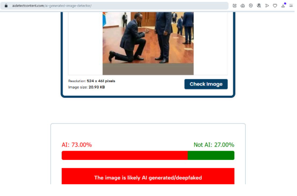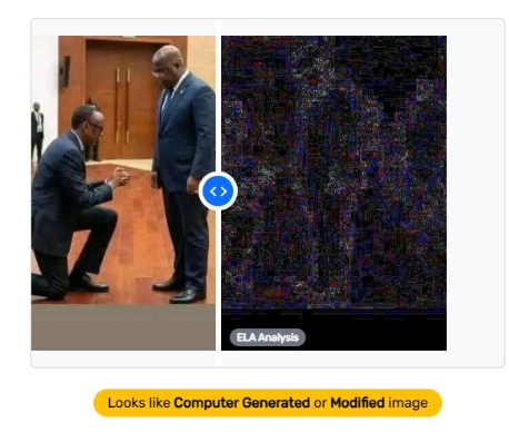 Les recherches indépendantes qu'Eleza Fact a portées sur l'image de Paul Kagame à genoux devant Félix Tshisekedi prouvent que la photo a été générée par intelligence artificielle. Le recours à de nombreux outils de vérification en témoigne. Les deux acteurs étant toujours dans le processus de recherche de la paix durable, il est nécessaire de vérifier les contenus avant de les propager dans les réseaux sociaux pour ne pas fragiliser les efforts de part et d'autre.
