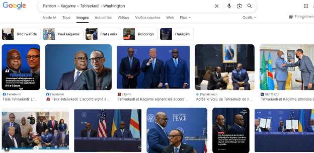 Légende : Capture des images de la recherche par mots-clés Pardon – Kagame – Tshisekedi – Washington. Effectuée par Eleza Fact
