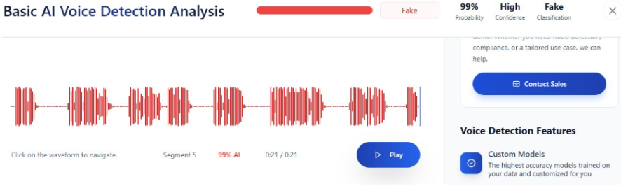 Pour commencer, AI Voice Detection classe le contenu de notre vérification dans la catégorie « Fake », avec une probabilité de 99 % de génération artificielle sur cet élément audio de 21 secondes. Donc, l’audio analysé présente des caractéristiques très fortement associées à une voix manipulée par IA.