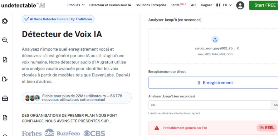 Nous avons, pour finir, confronté ce résultat à celui obtenu par un second outil, Undetectable AI, un autre détecteur de voix IA. Il a fourni le résultat selon lequel le fichier audio sous examen a été généré par intelligence artificielle à 99 % soit, une probabilité de 1 % que l’audio soit réel . Selon cet outil qui complète le premier, l’extrait audio analysé présente des caractéristiques acoustiques typiques d’une voix synthétique ou clonée.