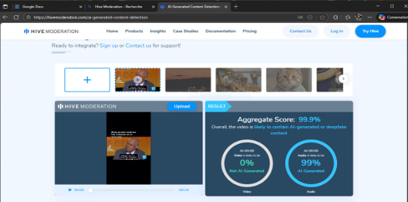 Pour en être sûre, Eleza Fact a donc soumis la séquence à l’outil de détection de contenus générés par l’IA, Hive Moderation. Les résultats indiquent que la vidéo a été produite par une intelligence artificielle avec un score de 99,9 %.