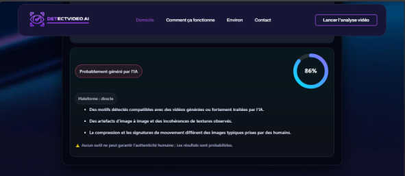 Pour renforcer la fiabilité de notre vérification, nous avons également eu recours à l’outil Detect Video AI, spécialisé dans l’analyse des contenus audiovisuels générés artificiellement. Selon les résultats obtenus, la plateforme attribue à la séquence examinée un score de 86 % de probabilité indiquant qu’elle aurait été générée par une intelligence artificielle.