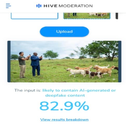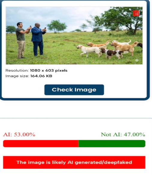 La photo montrant Félix Tshisekedi aux côtés de l'Émir du Qatar dans un camp avec des chiens est un fruit de l'IA. Eleza Fac l'a confirmé en analysant les éléments visuels sur l'image et en la soumettant à des outils de vérification tels que Hive Moderation et aicontentdetector, les résultats attestent qu'il s'agit d'une image manipulée.