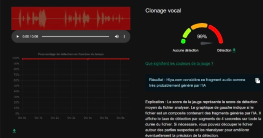 Pour confirmer cette vérification, nous avons soumis le son de la vidéo à la vérification via InVid We Verify. L’outil a donné un score de 99% de probabilité que le son soit le fruit d’une intelligence artificielle.