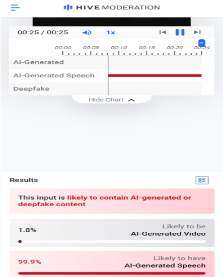 Soumise à plusieurs outils de détection, dont Hive Modération, le son de la vidéo a été identifié comme un contenu généré par intelligence artificielle avec un score de probabilité de 99,9% de génération artificielle de ce discours. Autrement dit, la voix que l’on entend n’est pas celle du chef de l’État Félix Tshisekedi, mais elle provient d’une imitation produite à l’aide de techniques d’IA.