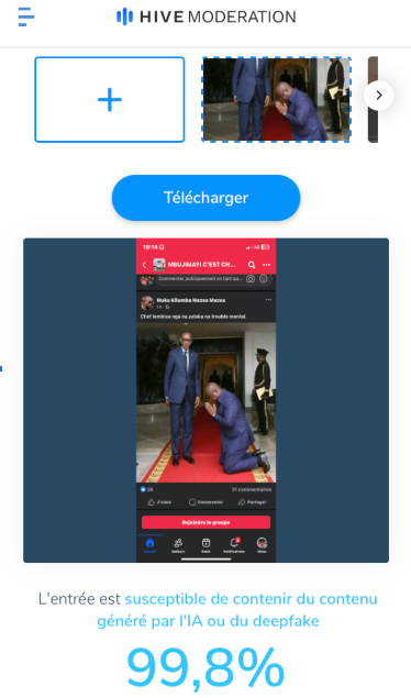 À ce stade de la vérification, Eleza Fact ayant constaté qué l’image sous examen semble donc avoir été modifiée sur base de celle ci-haut illustrée, l’a donc soumise à une vérification des images manipules, à l’aide de l’outil Hive Modération. Le résultat a relevé un score de 99.8% de probabilité que l’image ait été générée par l’intelligence artificielle.
