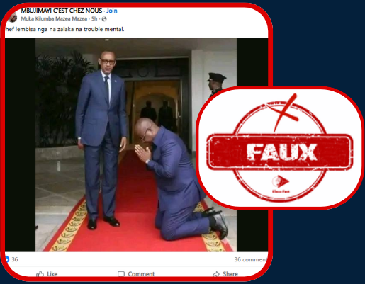 L’image prétendant montrer le président de la République démocratique du Congo, Félix Tshisekedi, agenouillé devant son homologue rwandais Paul Kagame, est en réalité un montage numérique (deepfake). Cette fausse image est apparue après le discours du chef de l’État congolais au Global Gateway Forum 2025 à Bruxelles, où il avait appelé à une « paix des braves » et à une coopération sincère entre les deux pays pour le bien de leurs peuples. Les vérifications menées par Eleza Fact à l’aide de Google Lens ont révélé que la photo truquée s’appuyait sur de véritables images prises à Kinshasa en 2019, lors d’une rencontre officielle entre Félix Tshisekedi et Paul Kagame dans le cadre de la demande d’adhésion de la RDC à la Communauté d’Afrique de l’Est (EAC).