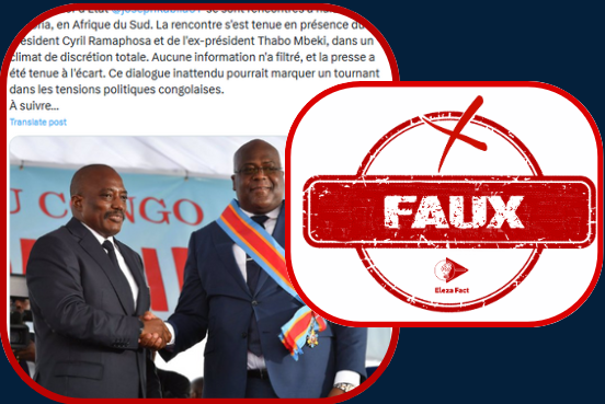 Par ailleurs, nous avons pris contact avec la conseillère en communication de Joseph Kabila, Barbara Nzimbi, afin d’obtenir des précisions quant à une quelconque rencontre entre Félix Tshisekedi et Joseph Kabila à Prétoria. Celle-ci nous a répondu formellement : « Faux ».