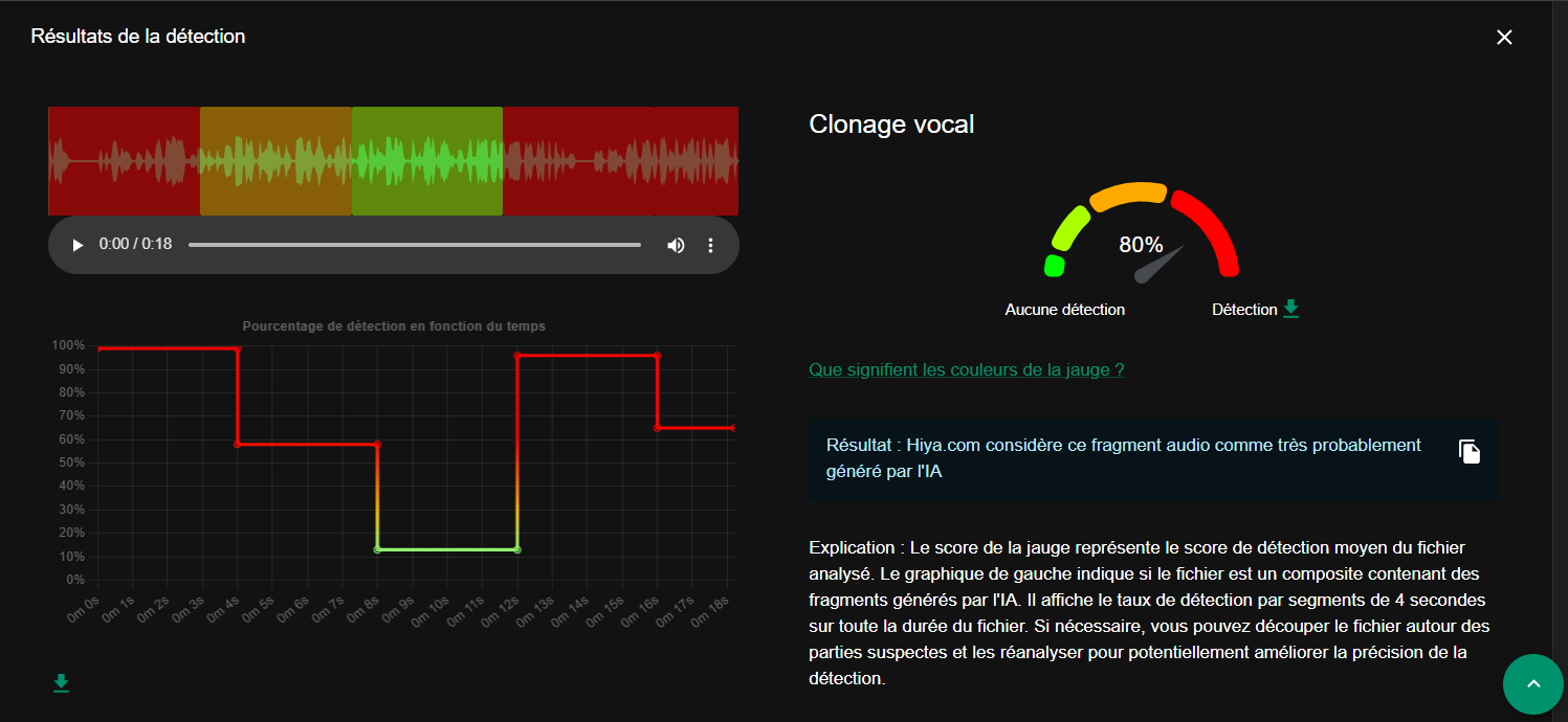 Enfin, nous avons recouru à l’outil Hiya d’Invid We Verify qui, ayant donné un score de probabilité de 80% de clonage vocal, a déclaré : “Résultat : Hiya.com considère ce fragment audio comme très probablement généré par l'IA”.