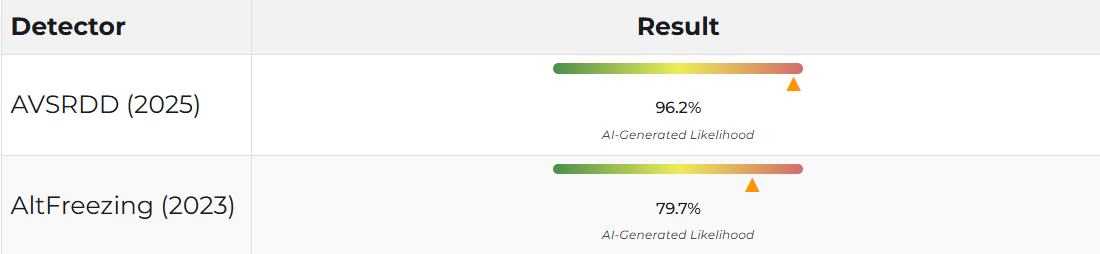 Enfin, le détecteur AltFreezing (2023), qui analyse les artefacts visuels structurels tels que les incohérences spatiales, les textures anormales ou les zones figées caractéristiques des images synthétiques, établit une probabilité de 79,7 % que le contenu soit issu d’une génération par intelligence artificielle. Bien que légèrement inférieur aux deux autres scores, ce résultat reste élevé et confirme la présence d’irrégularités visuelles associées aux deepfakes.