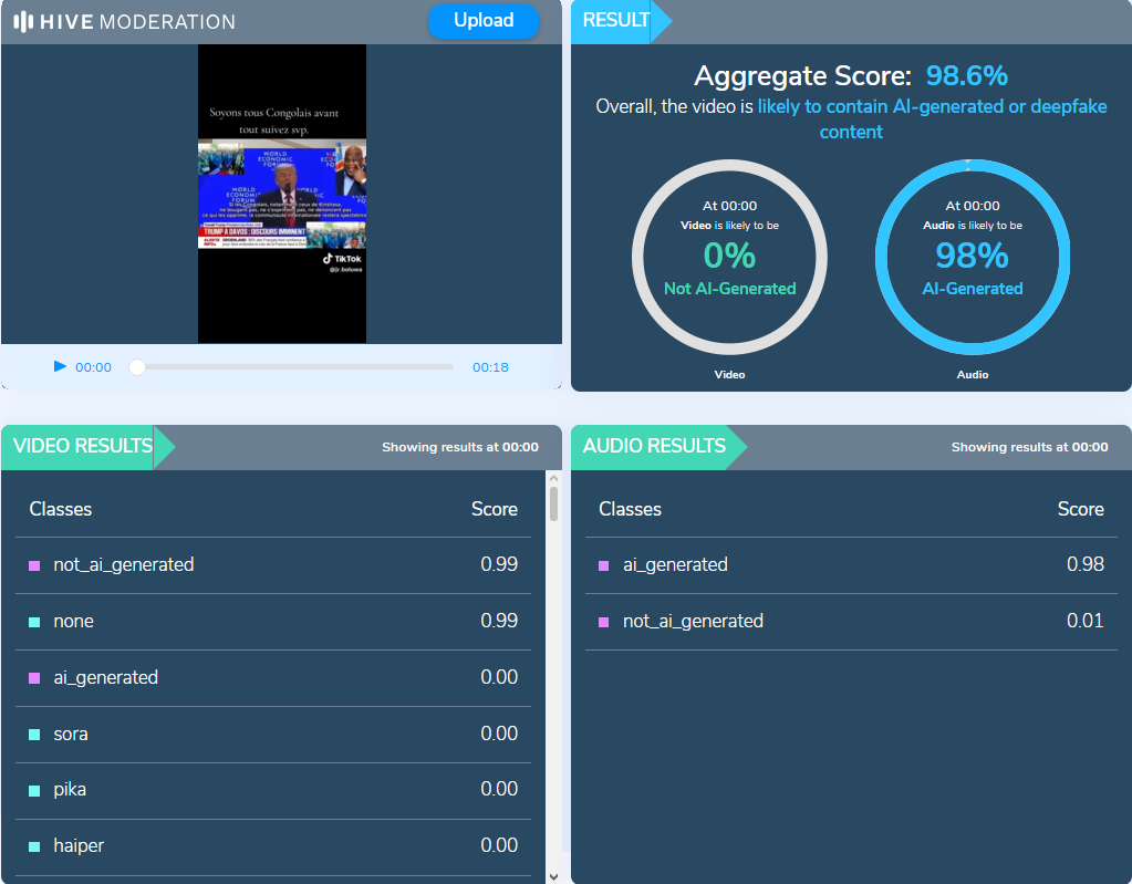 Compte tenu du fait qu’à aucun moment dans son discours trump n’évoque la RDC ni l’Afrique, il apparaît clairement que le contenu viral sur les réseaux sociaux a été manipulé. Nous avons donc utilisé des outils de détection des deepfake. Hive Moderation a donné une probabilité de 98% que le son dans la vidéo ait été généré artificiellement, alors que le visuel est authentique.