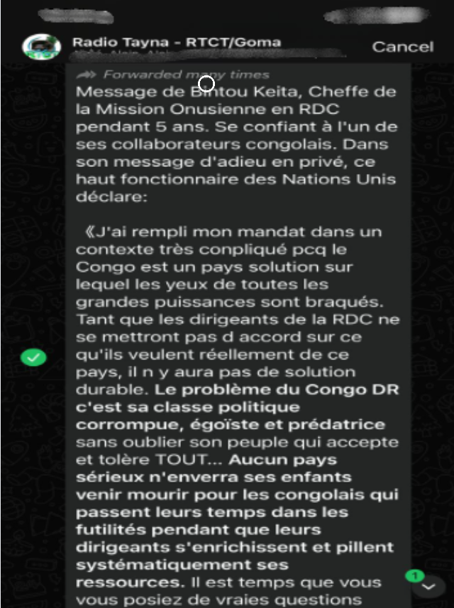 Le message a été retrouvé dans le groupe WhatsApp Radio Tayna – RTCT/Goma, qui compte plus de 300 membres. Il est attribué à Bintou Keita, ancienne Cheffe de la Mission des Nations unies en République démocratique du Congo, et est présenté comme un message privé adressé à l’un de ses collaborateurs congolais.