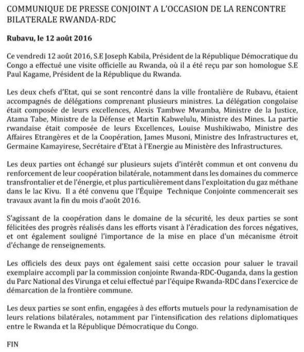 Légende : communiqué final de la rencontre entre Joseph Kabila et Paul Kagame, le 12 août 2016. Capturé par Eleza Fact sur Média Congo