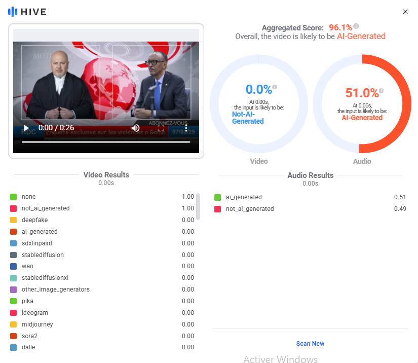 Tous comptes faits, nous avons donc fait appel à Hive Moderation, un outil spécialisé dans la détection des contenus générés par l’intelligence artificielle. Ayant soumis la vidéo à l’examen, nous avons obtenu un résultat écartant la possibilité que le contenu soit authentique : 96,1 % de possibilité qu’il ait été généré par une intelligence artificielle