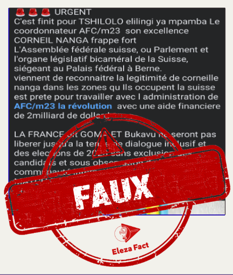 Le même jour, une publication diffusée sur Facebook a affirmé que la Suisse, à travers son Parlement, aurait reconnu la légitimité de Corneille Nangaa dans les zones contrôlées par l’AFC/M23. Le message soutient également que ce pays européen serait prêt à collaborer avec cette administration et à lui accorder une aide financière de 2 milliards de dollars américains.