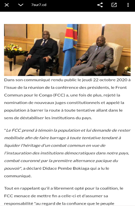 Nous avons soumis l’image à Google Lens, qui a renvoyé vers plusieurs articles publiés il y a trois à cinq ans, notamment celui du média en ligne 7sur7.cd (archivé ici) du 23 octobre 2020. Celui-ci rapporte que le Front Commun pour le Congo (FCC) avait menacé, dans un communiqué daté du 22 octobre 2020, de mettre fin à la coalition gouvernementale avec le CACH si ses revendications n’étaient pas prises en compte, en particulier le rejet de la nomination de trois juges constitutionnels jugée inconstitutionnelle.
