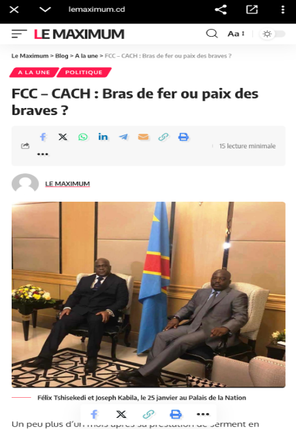 Un autre article, intitulé « FCC – CACH : Bras de fer ou paix des braves ? », publié le 26 février 2019 sur Le Maximum (archivé ici), a également utilisé l’image en illustration. L’article analysait les tensions politiques entre la coalition FCC (Front Commun pour le Congo), majoritaire au Parlement et affiliée à l’ancien président Joseph Kabila, et la coalition CACH (Cap pour le Changement) du nouveau président Félix Tshisekedi, un peu plus d’un mois après son investiture. Il souligne que l’incapacité à nommer rapidement un Premier ministre et à former un gouvernement reflète un véritable bras de fer sur la répartition du pouvoir, notamment concernant l’identification de la majorité parlementaire et la gestion institutionnelle. L’image est légendée : « Félix Tshisekedi et Joseph Kabila, le 25 janvier au Palais de la Nation ».