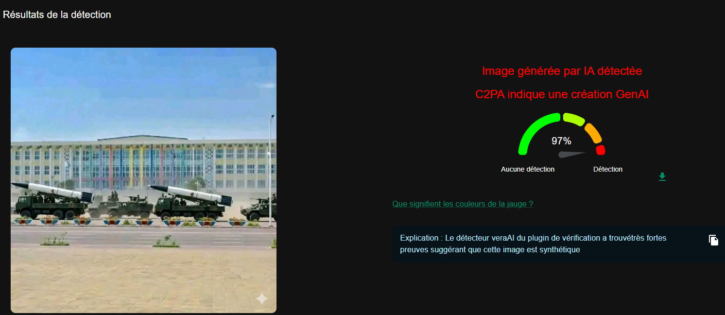 Les images prétendant montrer des missiles et des armes nucléaires transportés dans les rues de Kinshasa sont fausses et relèvent de la désinformation. Les vérifications techniques menées à l’aide de plusieurs outils spécialisés démontrent clairement qu’il s’agit d’images générées par l’intelligence artificielle. Elles présentent de nombreuses incohérences visuelles et portent des indices explicites de génération artificielle, notamment des filigranes d’outils d’IA et des anomalies graphiques. En outre, la République démocratique du Congo ne possède ni armes nucléaires ni programme nucléaire militaire, conformément à ses engagements internationaux. Ces contenus trompeurs exploitent le contexte sécuritaire tendu pour semer la confusion et induire le public en erreur. C’est pourquoi il est important de toujours vérifier avant de partager ou confirmer une information.