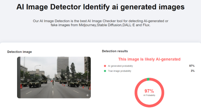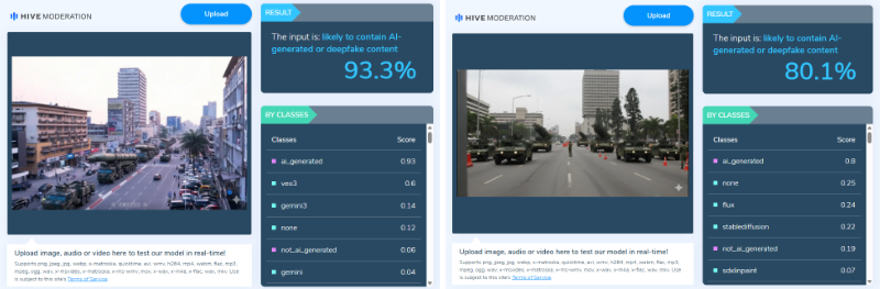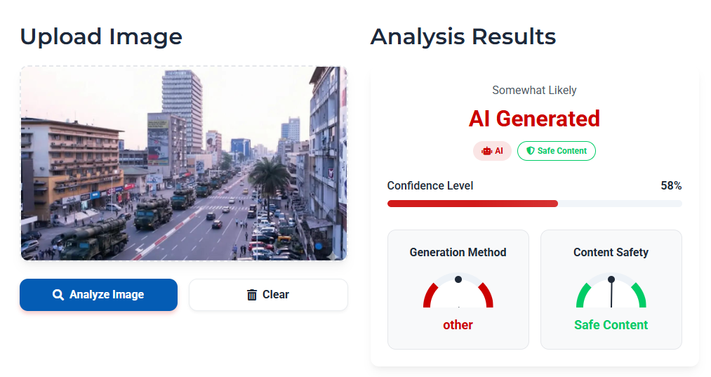 Après des analyses minutieuses menées par Eleza Fact à l’aide de plusieurs outils spécialisés, notamment Hive Moderation, Decopy AI, Is it AI, Was It AI et Invid We Verify, il a été révélé que les images diffusées ne sont pas authentiques. Les résultats de ces vérifications convergent vers la conclusion que les visuels en question ont été générés par une intelligence artificielle et ne correspondent pas à une situation réelle observée à Kinshasa.