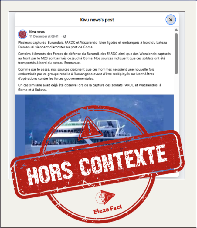 À la suite de violents affrontements dans la plaine de la Ruzizi notamment à Luvungi et Katogota (archive consultable ici) la ville d’Uvira est passée sous le contrôle de l’AFC/M23 le 10 décembre dernier, après le retrait des FARDC et des groupes Wazalendo vers Fizi. C’est dans ce contexte mouvant et tendu qu’une publication diffusée sur Facebook le 11 décembre a retenu l’attention d’Eleza Fact. Celle-ci montre un bateau naviguant sur un lac avec plusieurs passagers à son bord. La publication affirme qu’il s’agit du bateau Emmanuel 3 accostant à Goma, transportant des militaires burundais ainsi que des éléments des FARDC et des Wazalendo capturés par l’AFC/M23 sur le front d’Uvira.