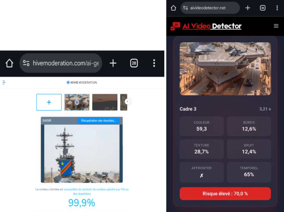 Les vérifications techniques, les incohérences physiques, l’identification du navire réel, l’analyse des sources de diffusion et les résultats des outils de détection d’IA démontrent que la vidéo prétendant montrer un porte-avions congolais baptisé « CD-LM45 » transporté sur une autoroute est un deepfake. Il s’agit d’un contenu fictif, généré par intelligence artificielle, sans aucun lien avec une capacité militaire réelle de la RDC.