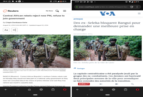 La première image apparaît dans un article (archivé ici) de VOA Afrique, publié le 13 novembre 2014. Cet article documente le blocage de plusieurs axes à Bangui par d’anciens combattants de la Séléka, qui avaient dressé des barricades sur deux grandes avenues pour réclamer une « meilleure prise en charge » de la part du gouvernement de transition. Leur ultimatum ayant expiré, ils avaient paralysé la circulation sans ouvrir le feu. Malgré la présence des casques bleus de la MINUSCA, les ex-Séléka étaient restés positionnés sur les barricades jusque tard dans la journée, tandis que des pourparlers étaient engagés entre leurs représentants et les autorités. La description associée à cette image indique : « Des ex-Séléka de la ville de Lioto ».
