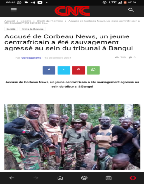 La deuxième image est sur le site de CNC (Corbeau news centrafrique) en illustration d’un article (archivé ici) mis en ligne le 15 décembre 2025; l’article documente l’agression d’ un jeune homme d’une vingtaine d’années le 21 juin 2024 au Tribunal de Grande Instance de Bangui après avoir filmé l’arrivée de deux détenus. Des militaires l'ont accusé d’être un journaliste de Corbeau News, l’ont plaqué au sol, étranglé, passé à tabac et l’ont emmené vers une destination inconnue, tout en confisquant son téléphone. Corbeau News a dénoncé cette attaque comme faisant partie d’une vaste campagne de répression orchestrée par le pouvoir centrafricain et les mercenaires russes de Wagner contre leur média.