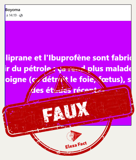 Dans sa publication Facebook datée du dimanche 5 avril 2026, Fabrice Boyoma affirme : « Le Doliprane et l’ibuprofène sont fabriqués à partir du pétrole : ça rend plus malade que ça ne soigne (ça détruit le foie, le fœtus), selon des études récentes. » Sa page, suivie par près de 2 000 personnes, le présente comme écrivain, juriste (avocat), enseignant (assistant à l’ESU).