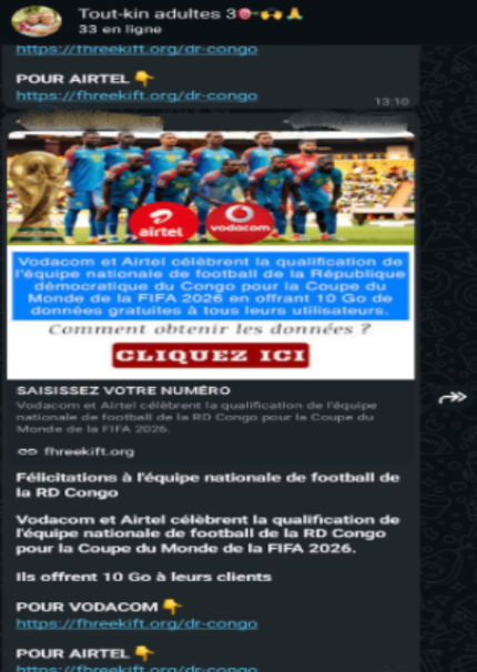 Dans cet élan de célébration, un lien circulant dans plusieurs groupes WhatsApp renvoie vers un formulaire prétendument offert par Airtel et Vodacom. Celui-ci promet 10 Go de connexion gratuite pour « célébrer la qualification » des Léopards.