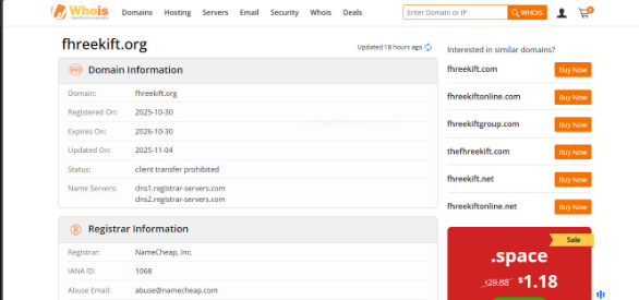 Pour parfaire notre recherche, nous avons soumis le lien freekift.org à l'outil d’authentification WHO IS. Les résultats indiquent que ce domaine a été créé récemment, le 30 octobre 2025, ce qui constitue un premier signal d’alerte. Les sites liés à des services officiels ou à des entreprises reconnues possèdent généralement un historique plus ancien et vérifiable, tandis que les nouveaux domaines sont souvent liés à des activités frauduleuses.