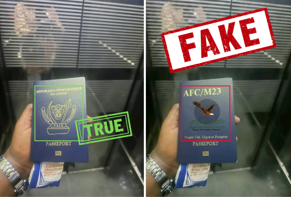 Dans ce contexte de tensions administratives et politiques entre Kinshasa et les zones contrôlées par le mouvement, une image prétendant représenter un nouveau passeport estampillé “AFC/M23” a commencé à circuler massivement sur X (ancien Twitter), Facebook et divers blogs en ligne dès le 5 octobre. Les publications affirmaient que ce document devait remplacer les passeports officiels de la République démocratique du Congo dans les territoires occupés par l’AFC/M23.