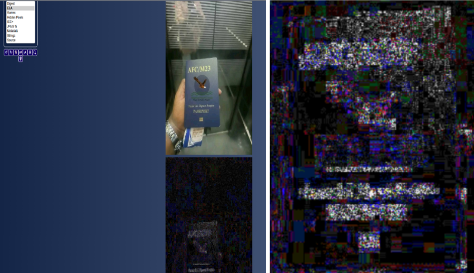 Les analyses techniques menées via Fotoforensics et l’outil ELA (Error Level Analysis) d’InVid We Verify confirment ces observations. Les différences de compression autour du logo et du texte “AFC/M23” montrent une superposition numérique postérieure. Les différences de netteté et de texture sur l’image — comme les zones un peu floues ou granuleuses (petits points) autour des lettres — montrent que ces éléments ont été ajoutés par retouche numérique sur une photo déjà existante, et qu’il ne s’agit donc pas d’un vrai passeport imprimé.