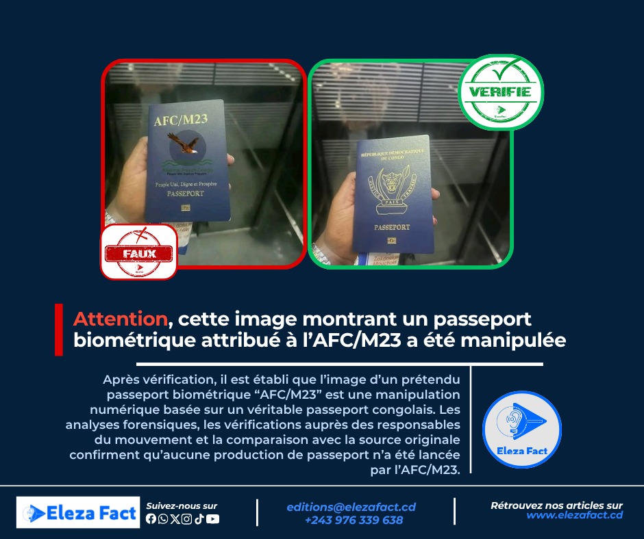 Après vérification, il est établi que l’image d’un prétendu passeport biométrique “AFC/M23” est une manipulation numérique basée sur un véritable passeport congolais. Les analyses forensiques, les vérifications auprès des responsables du mouvement et la comparaison avec la source originale confirment qu’aucune production de passeport n’a été lancée par l’AFC/M23.