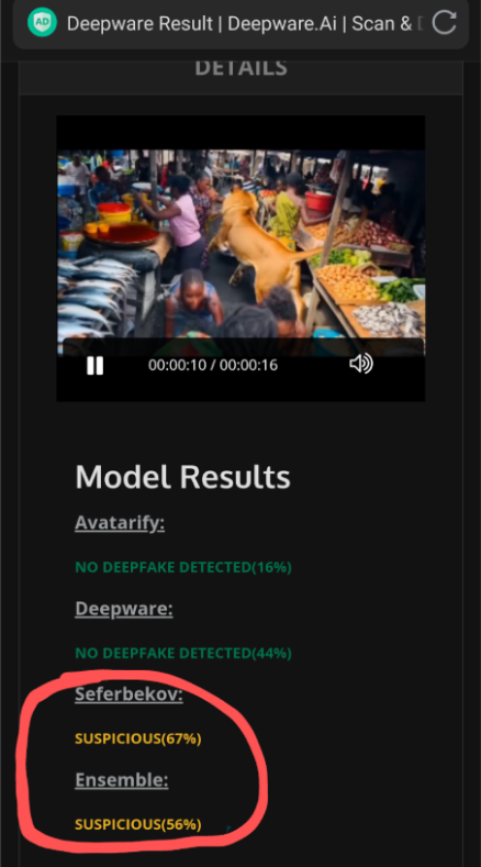 L’outil Deepware.ai indique que la vidéo est susceptible d’avoir été modifiée par l’IA avec un score moyen de 56 %.