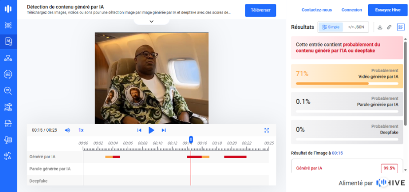 L’analyse effectuée à l’aide de l’outil Hive Moderation indique une probabilité de 71 % que la vidéo soit générée par intelligence artificielle.
