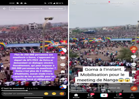 Une première capture d’écran provient d’une vidéo de 38 secondes publiée ce lundi 22 décembre sur TikTok par le compte C’est le moment (plus de 97 400 abonnés). La séquence est accompagnée d’un texte affirmant : « Plus de 250.000 personnes ont manifesté à Goma, s'opposant au départ de AFC/M23 de Uvira en demandant un dialogue sincère. Honnêtement, qui peut imposer à 200.000 personnes de manifester? Goma c'est plus de 2 millions d'habitants, aucun stade n'a la capacité de les accueillir pour un "meeting forcé et obligatoire” », laissant entendre qu’il s’agit d’images tournées lors de la marche du 22 décembre. 9h plus tard, la vidéo obtient plus 260 600 vues, 6 652 mentions “j’aimé”, 800 commentaires et 1 134 partages.