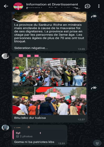 Un second visuel, largement diffusé dans des groupes WhatsApp, est présenté comme montrant des manifestants de la marche du 22 décembre brandissant des pancartes « Rwanda is killing ». Là encore, l’image est utilisée comme preuve visuelle de la mobilisation.