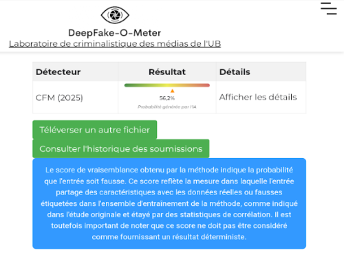 En complément, une analyse via l’outil Deepfake-o-Meter de l’Université de Buffalo indique une probabilité de 56,2 % que l’image soit générée ou modifiée par intelligence artificielle.