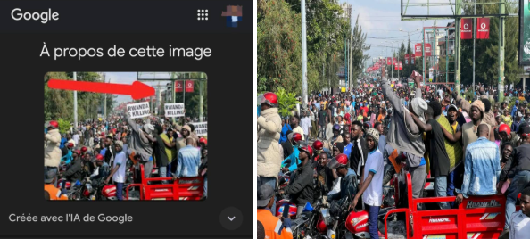 Cependant, à l’observation attentive, plusieurs incohérences apparaissent, notamment au niveau des mains censées tenir les pancartes blanches comportant l’inscription « Rwanda is killing ».